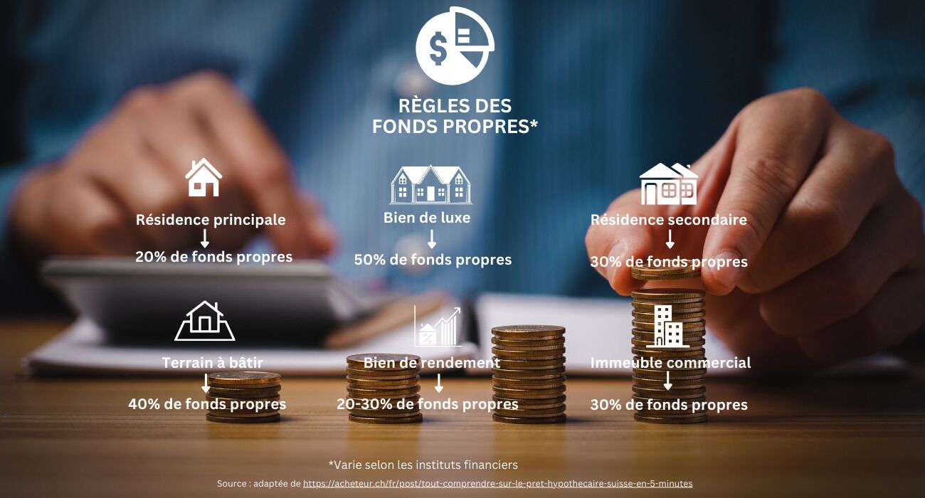 La part des fonds propres doit représenter plus ou moins 20% du prix d'achat du bien immobilier. La part de fonds étrangers (hypothèque), elle, s'élève à environ 80% de la valeur estimée du bien immobilier par la banque (peut différer du prix d'achat). De même, les charges de l'hypothèque telles que les intérêts, l'entretien et l'amortissement ne doit pas excéder 1/3 du revenu brut annuel.